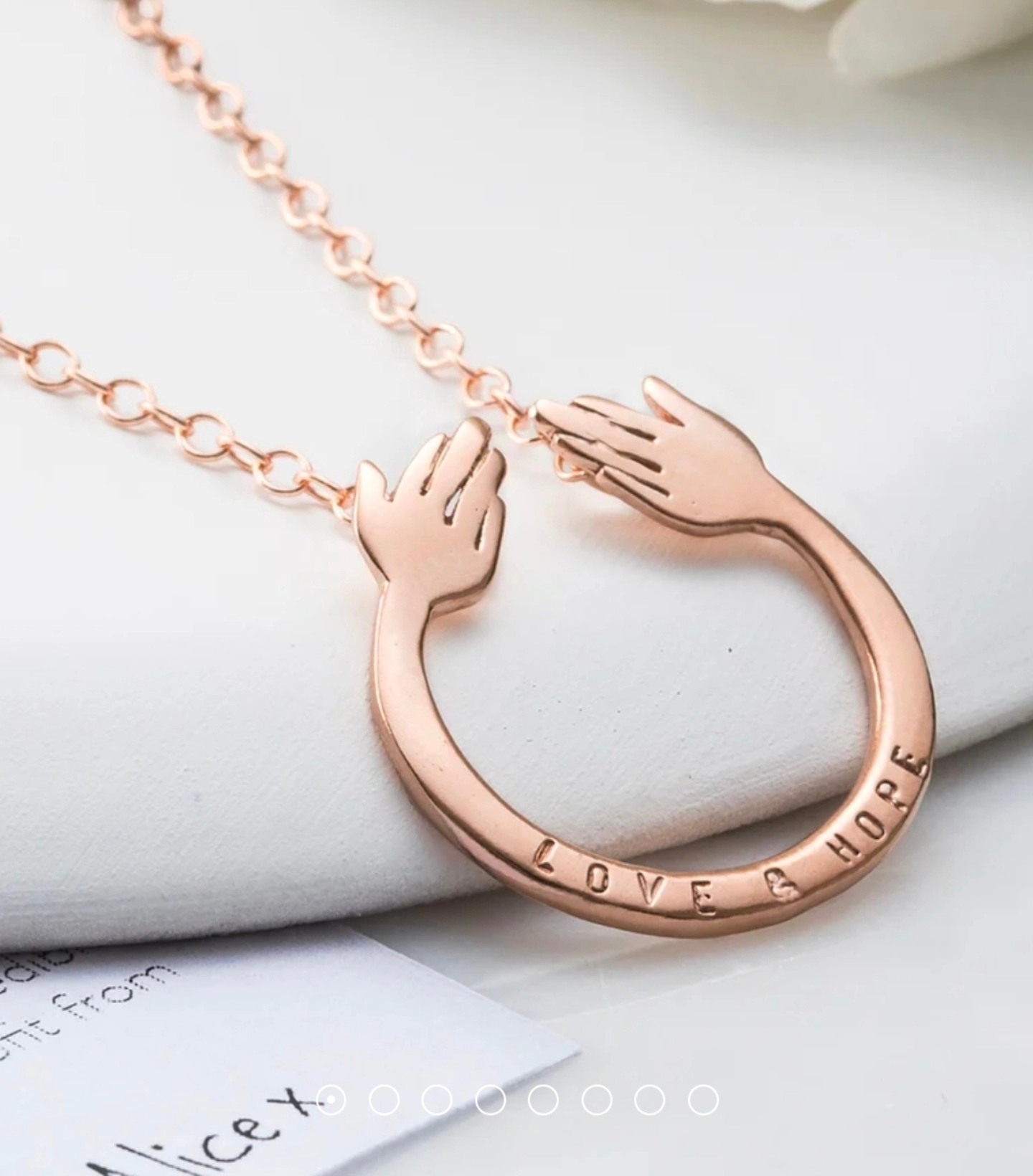 Alice vizitoi për herë të parë Kosovën në vitin 2016 bashkë me @womenforwomen, ku u takua me gra frymëzuese, fuqia dhe qëndrueshmëria e të cilave e prekën thellë. Kjo përvojë e frymëzoi atë të krijojë unazën “Share A Hug” – një pjesë e dedikuar grave të Kosovës, ndërsa të ardhurat nga shitjet mbështesin Women for Women International, duke ndihmuar gratë në mbarë botën të rindërtojnë jetët e tyre.